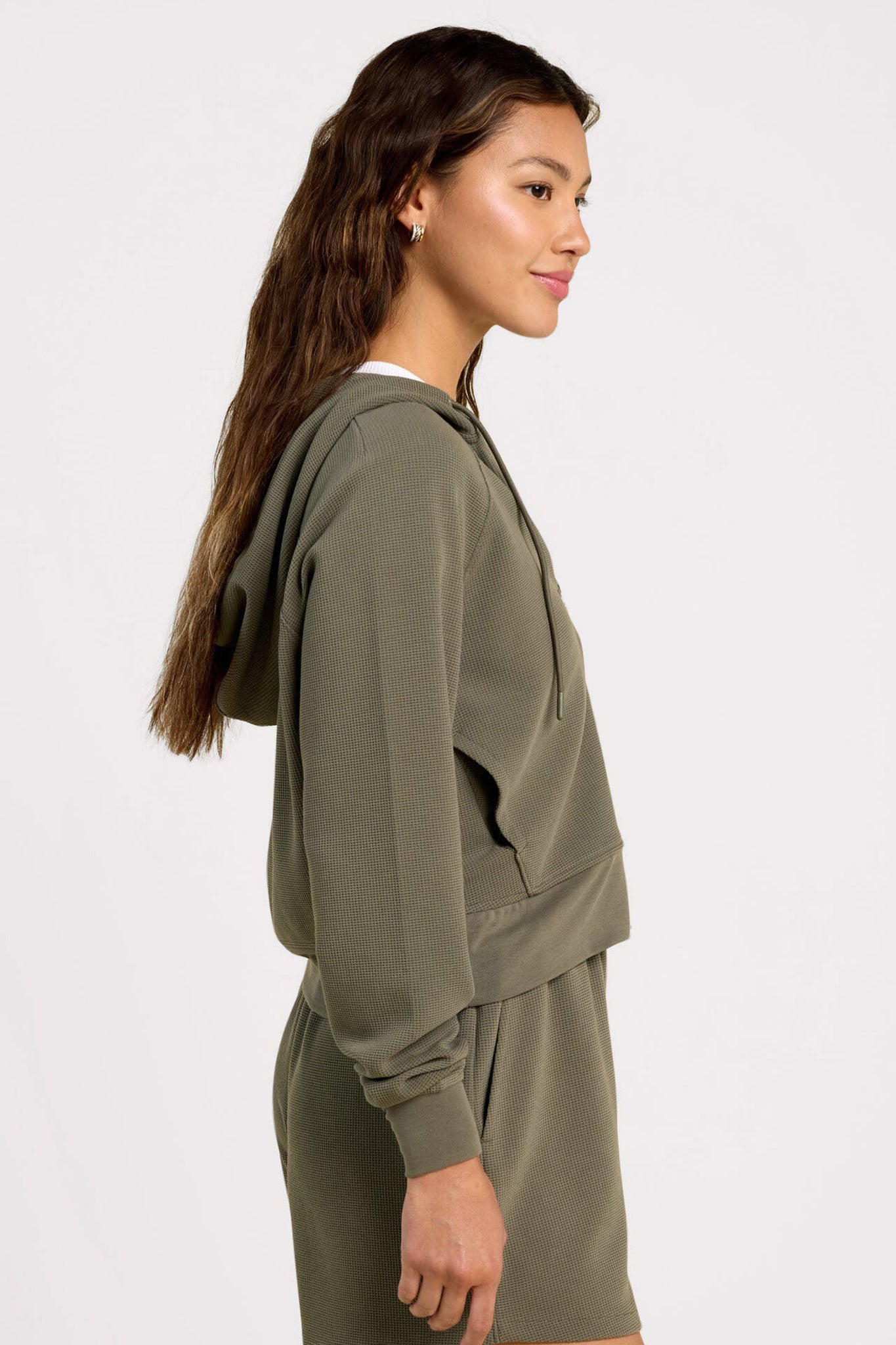 I LOVE this hoodie! Grabbed while on sale but easily worth full price. It is the perfect stretchy, lightweight waffle. Great piece to transition to spring! Will definitely order in olive!