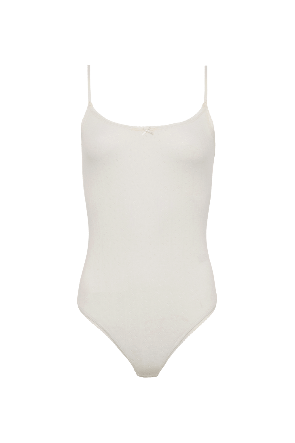 The Pointelle Bodysuit is elegant and designed for those who appreciate the perfect blend of delicate texture and charm. Made from our pointelle knit—a luxurious cotton blend with intricate openwork patterns—this bodysuit is breathable, lightweight, and gentle on your skin. Every stitch and detail, from the scalloped lace trim at the neckline to the satin bow in the center, speaks to comfort and style. Adjustable straps ensure a personalized fit while the thong back with discreet snap closures offers seamless wearability. Designed to be as versatile as it is beautiful, this piece transitions effortlessly from loungewear to layering essential, making every moment feel special.