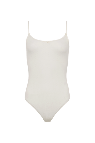 The Pointelle Bodysuit is elegant and designed for those who appreciate the perfect blend of delicate texture and charm. Made from our pointelle knit—a luxurious cotton blend with intricate openwork patterns—this bodysuit is breathable, lightweight, and gentle on your skin. Every stitch and detail, from the scalloped lace trim at the neckline to the satin bow in the center, speaks to comfort and style. Adjustable straps ensure a personalized fit while the thong back with discreet snap closures offers seamless wearability. Designed to be as versatile as it is beautiful, this piece transitions effortlessly from loungewear to layering essential, making every moment feel special.