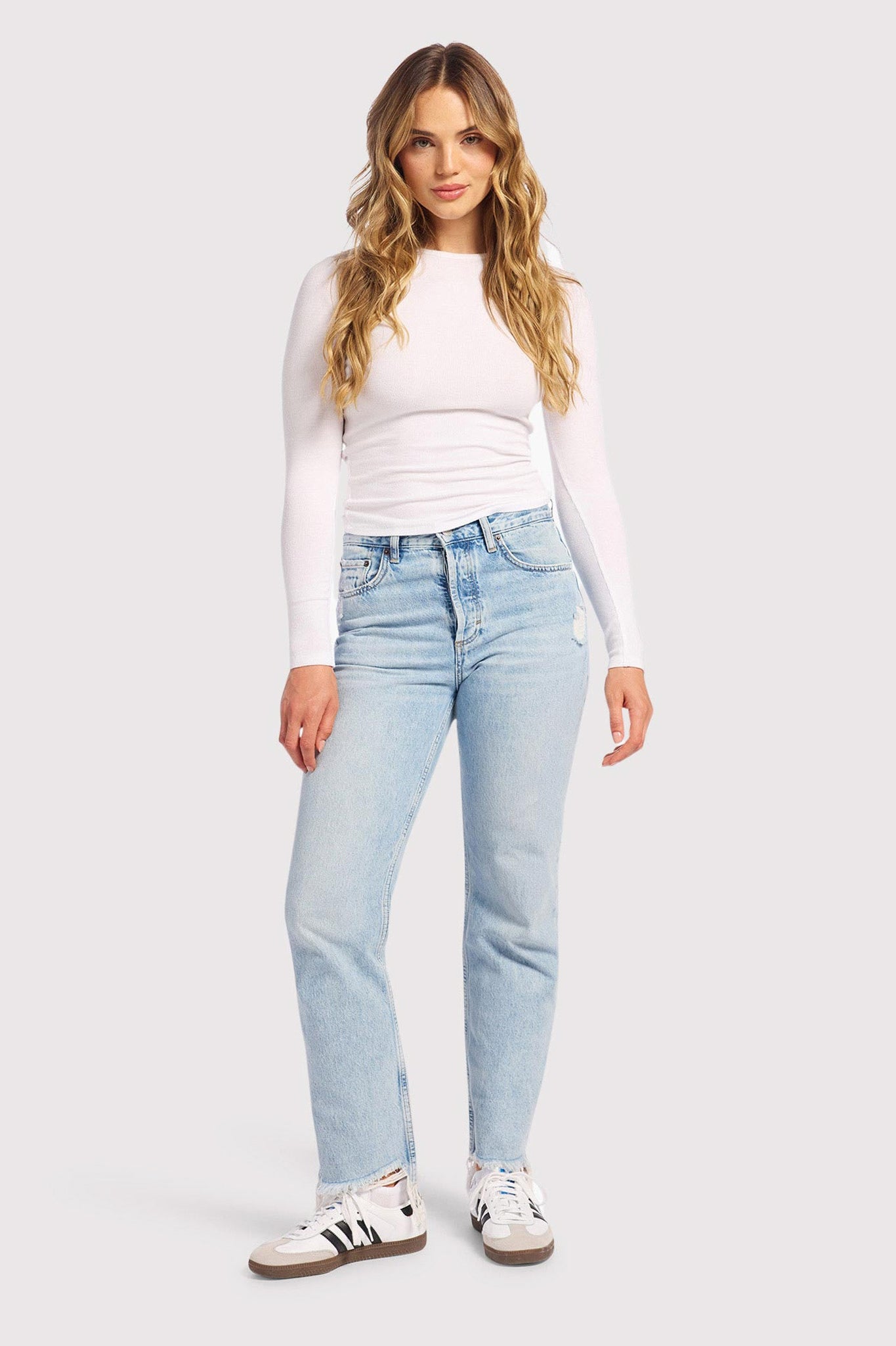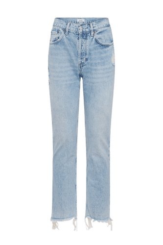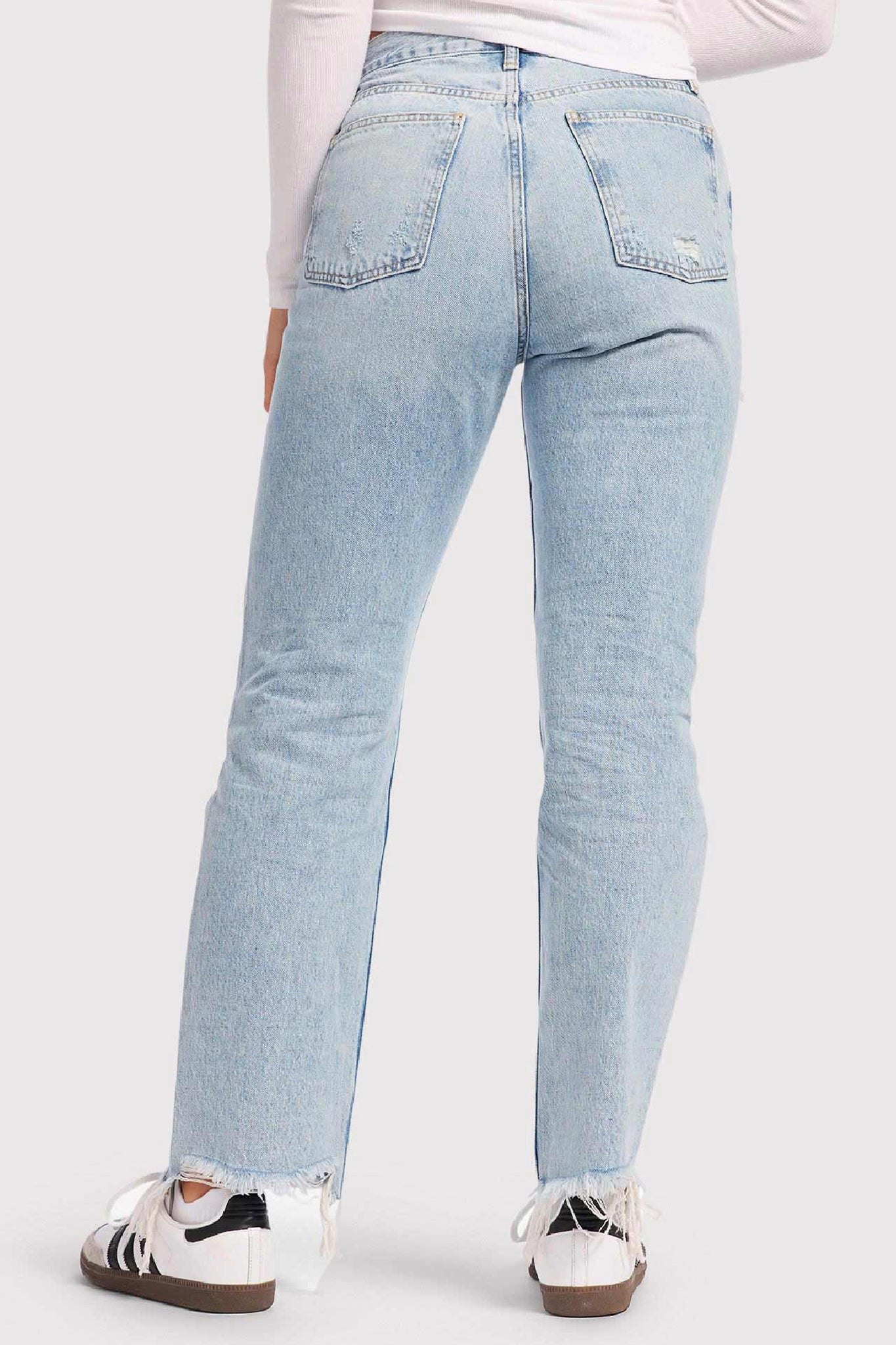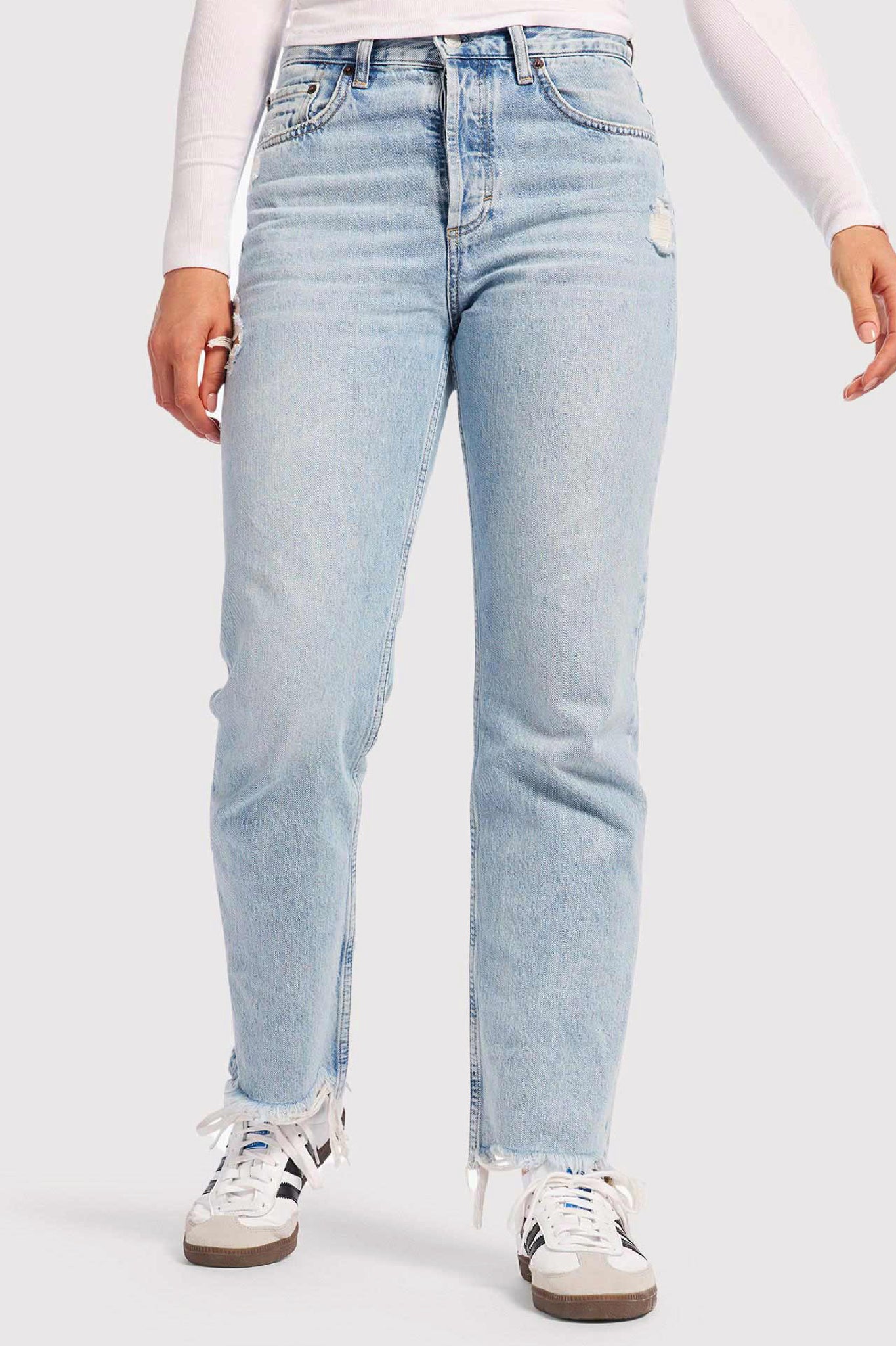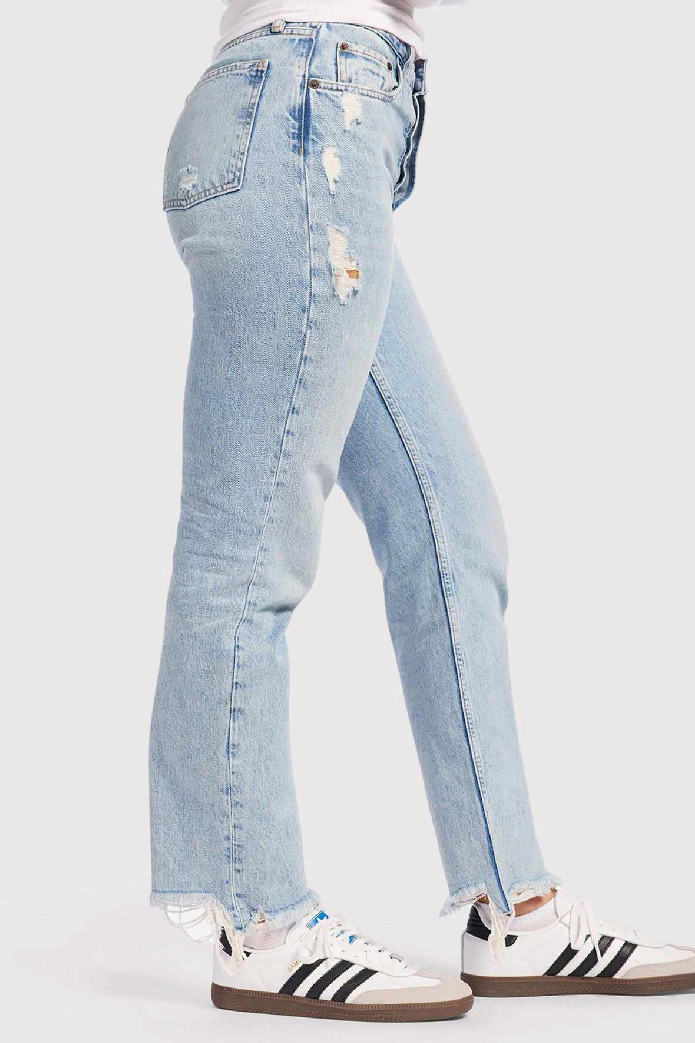 - Raw hem and rips placed throughout the jean