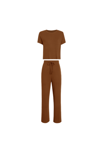 - Slightly cropped, boxy tee & high-waisted drawstring pant set