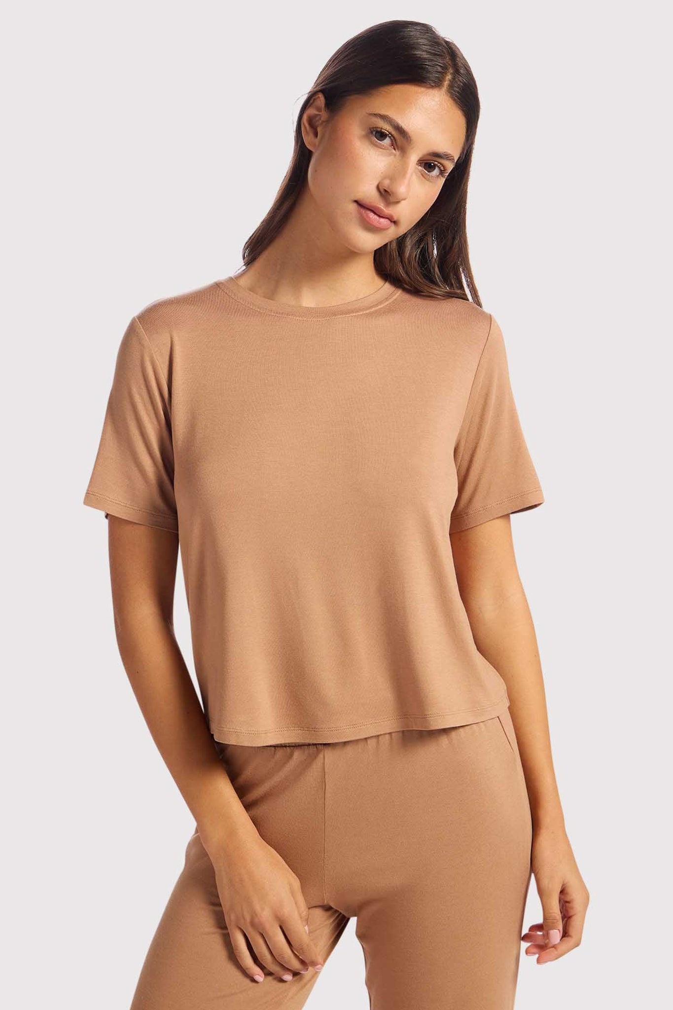 - Slightly cropped, boxy tee & high-waisted drawstring pant set