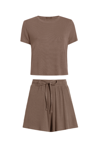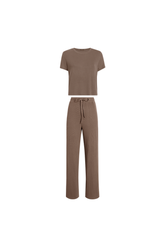 - Slightly cropped, boxy tee & high-waisted drawstring pant set